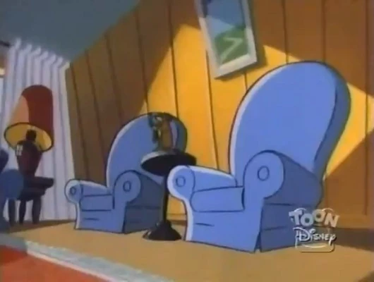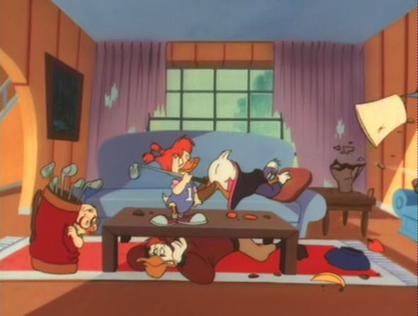 The walls hold a family portrait, as well as a TV that is constantly cycling through clips of news footage featuring some of Darkwing Duck's more noteworthy victories over villains such as Taurus Bulba, Steelbeak, and The Fearsome Five. There is no sound, however.